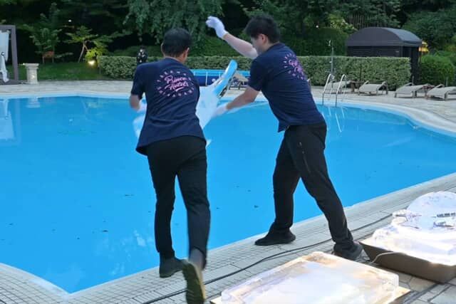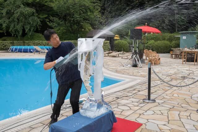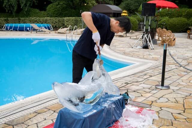 ▲完成した氷彫刻は、プールの中に投げ込みます