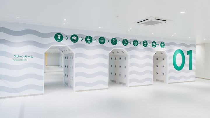 クリーンルームのエアーシャワーを使ってホコリやゴミを取る工程を体験し、衛生面への取り組みを学びます。