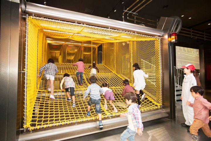 巨大な工場の中でカップヌードルの“麺”となり、製麺から出荷されるまでの製造工程を体感できるアスレチック施設は子どもたちに人気。