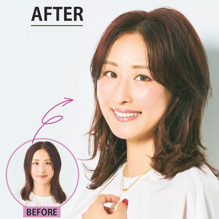 BEFOREのようにトップにボリュームがなくフェイスラインに髪が沿うようなシルエットだと、地味な印象に。根元をしっかり立ち上げて顔周りにニュアンスを出すことでふんわりした立体感と華やかさが。