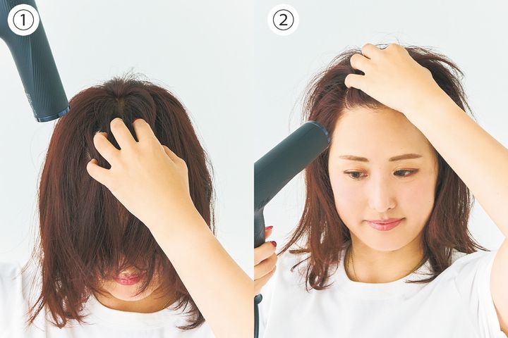 根元の立ち上がりが最重要。ドライヤーは頭頂部から下に向かってあてると自然な立ち上がりに。下を向いて乾かすと楽。