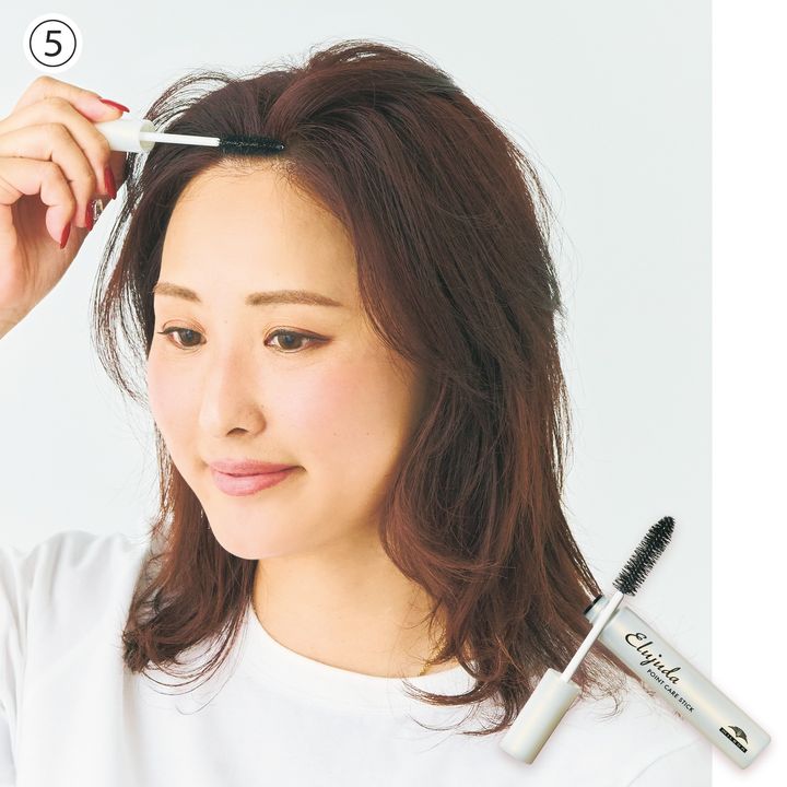 ⑤根元の立ち上がりをキープするにはスタイリング剤選びと量に気をつけて。ピンポイントに塗布できるマスカラタイプが正解です。