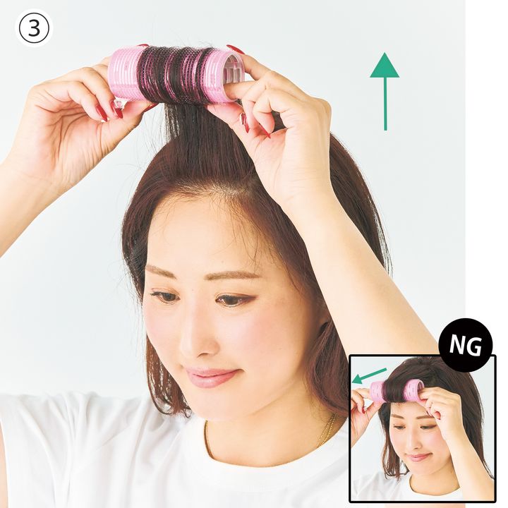 ③前髪のカーラーは垂直方向に巻くのが正解
