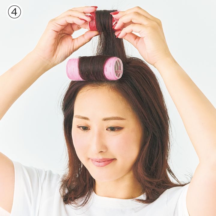 ④頭頂部の髪も同じように垂直に巻いて