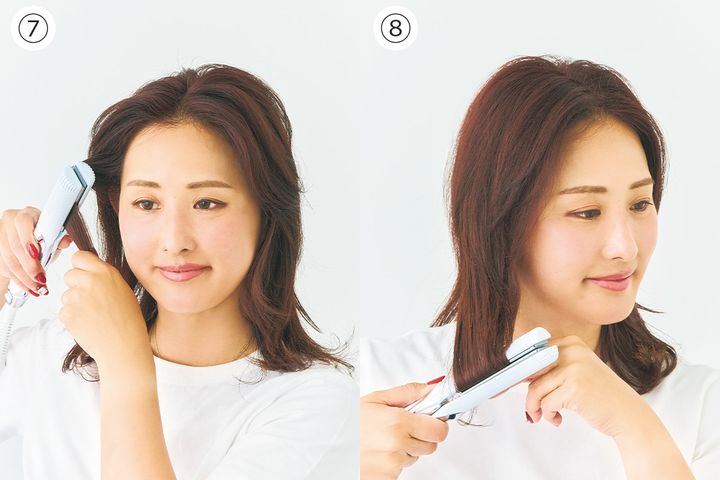 ⑧ボリュームアップのために、毛先も軽く内巻きに。毛量の少なさを感じさせず、ふんわり軽やかな今っぽヘアの完成です。