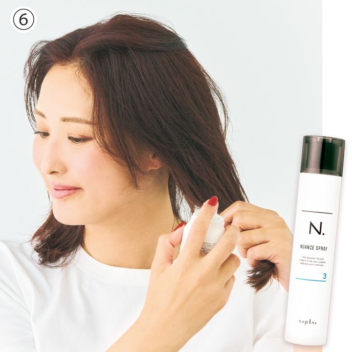 ⑥キープしつつツヤ髪に仕上がるスプレーを外側に。油分が多いものはペタッとしてしまうので避けて。
