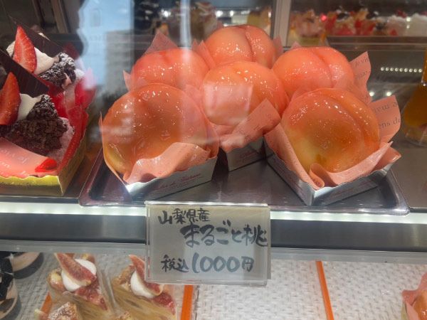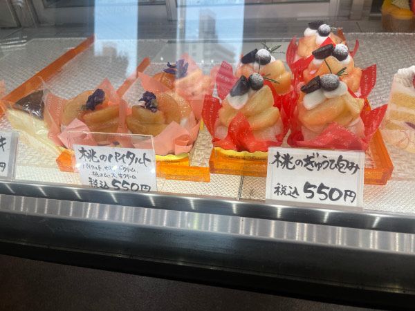 店員さんにお話を伺うと、旬である桃を使ったケーキがオススメとのことで、 様々なケーキが並んでいて、どのケーキにしようか悩みました。