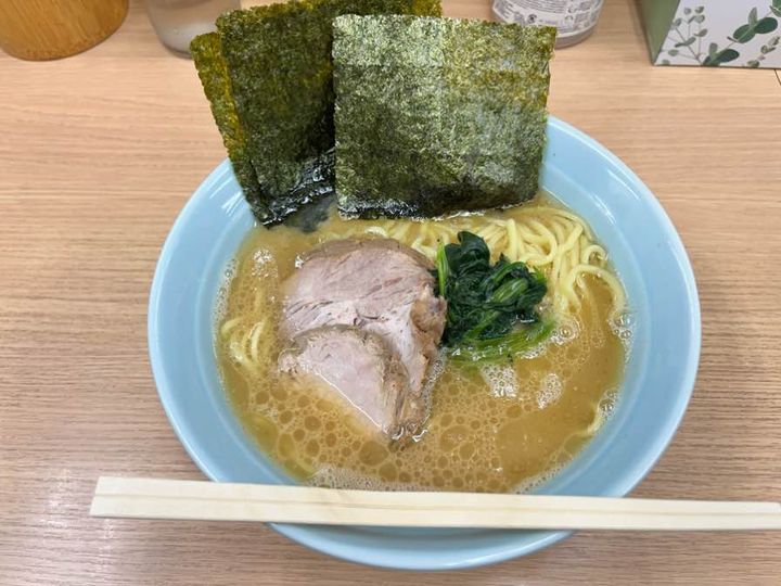 家系ラーメンのお手本というくらいきれいなラーメンが出てきました。チャーシュー・ほうれん草・海苔です。いろいろな系列の家系がありますが、私の好きな優しい系のスープで食べやすいラーメンでした。