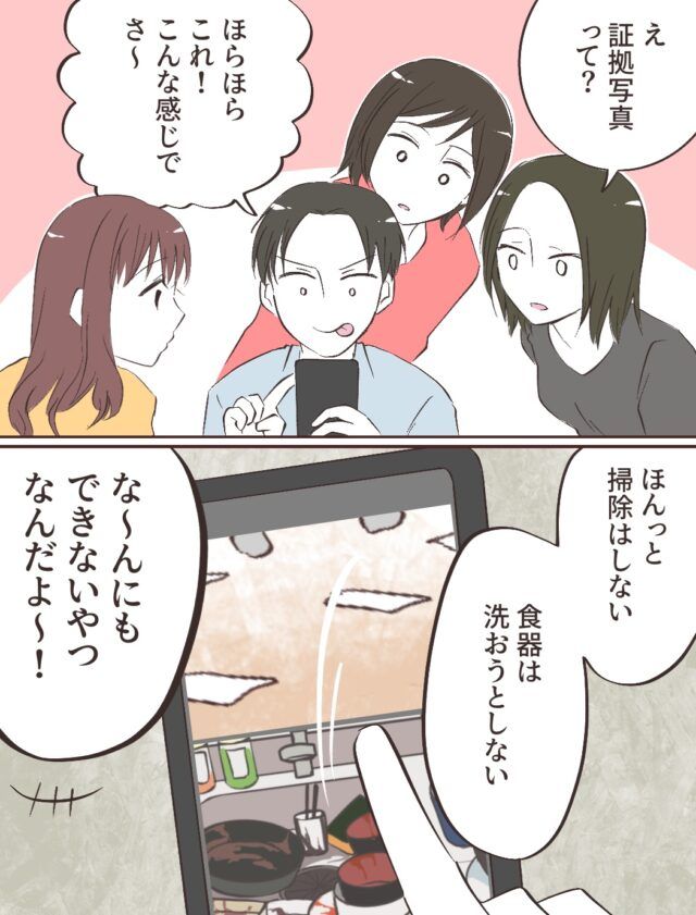 「証拠写真って?」と同僚女性が聞いたので、キョウスケさんは得意になってそれまでに撮り溜めたカホさんが忙しくて家事に手が回らずにいたときのキッチンや部屋の写真をみんなに見せ、「ほんっと掃除はしない、食器は洗おうとしない、な~んにもできないやつなんだよ~!」と嬉しそうにさえ見えます。
