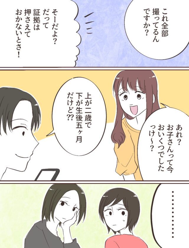 「証拠は押さえておかないとさ!」とまるで正義かのように言うキョウスケさんに、同僚女性は「あれ?お子さんって今おいくつでしたっけ~?」と聞きました。なぜそんなことを聞くの?という顔でキョウスケさんが「上が2歳で下が生後5ヶ月だけど?」と答えると、同僚女性たちはただ黙ってキョウスケさんのことを見ていました。