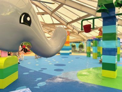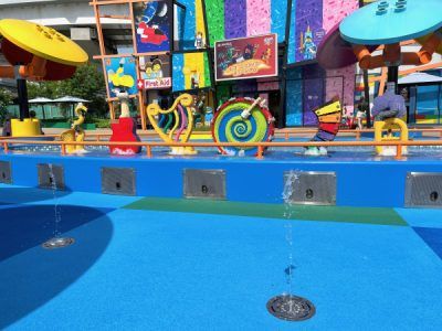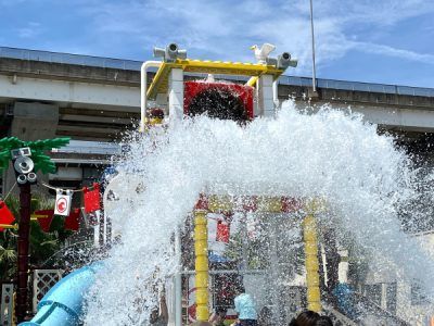 こちらは少し年齢が上の子どもが楽しめるスポット。レゴ®ブロックをイメージしたすべり台やシャワーで構成され、自分がレゴ®の世界に迷い込んだかのような世界観。なおかつ大胆な水使いは圧巻!期待を裏切らない、真夏の水遊び体験ができます。
