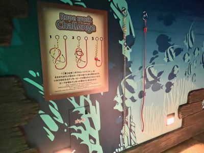 海での道具や、魚のヒミツなど謎を解いたりチャレンジをしてミッションをクリアしていくのも楽しい。ここでは、ほどけないロープの結び方。移動中も飽きさせない工夫がたくさん隠されています。隅々まで、しっかり見学してみてください。