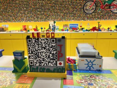これは、ホテルのインフォメーションが見られるサイトに飛ぶQRコード、なんとブロックでできています。後ろの壁にもたくさんのレゴ®ブロックが並び、パークでの楽しい気持ちをそのままに。