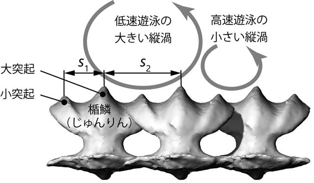 その結果、大突起同士の広い間隔の楯鱗(S2)は遊泳速度2〜3メートル毎秒に最適で、大突起と小突起の狭い間隔の楯鱗(S1)は遊泳速度5〜7メートル毎秒に最適であることが判明しました。