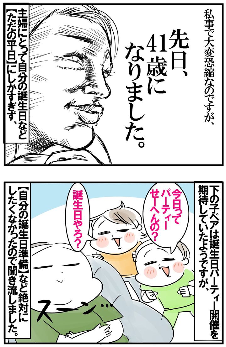 先日、41歳の誕生日を迎えたんですが、主婦にとって、自分の誕生日などただの平日以外の何物でもなく…。