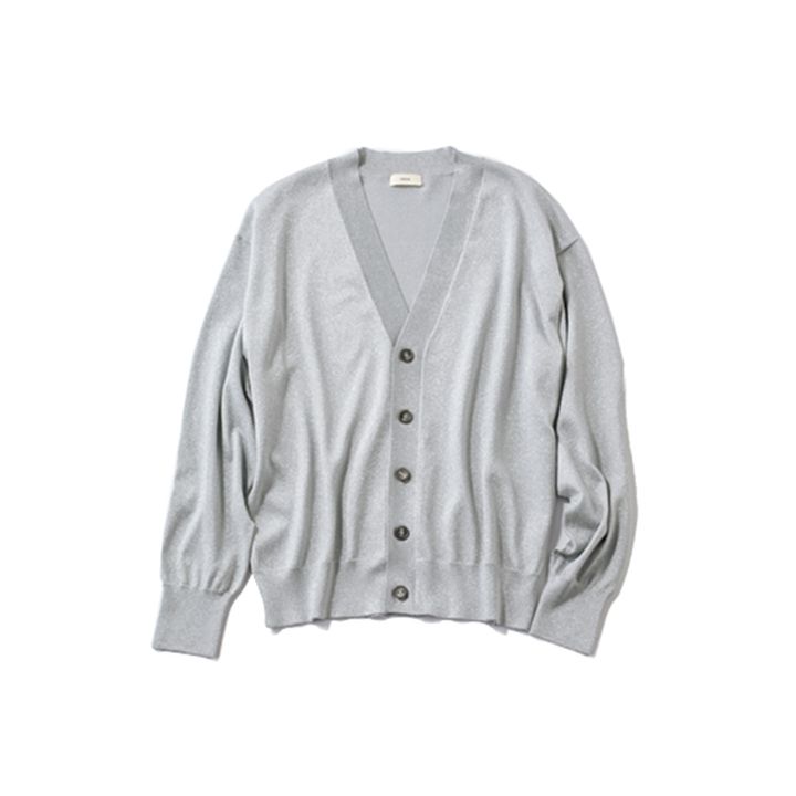 上品な輝きと透け感のラメカーデ。ゆったりとしたシルエットが合わせやすさ抜群。カーディガン¥19,910(ネイヴ)