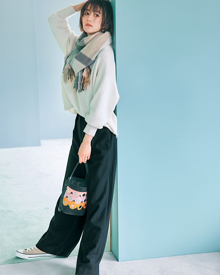 パンツ¥53,900(エイトン/エイトン青山)ニット¥33,000(ebure/ebure GINZA SIX店)バッグ¥172,700(ピエール アルディ/ピエール アルディ 東京)スニーカー¥7,150(コンバース/コンバースインフォメーションセンター)ストール¥80,300(ベグ アンド コー/ボーダレス)ピアス¥21,670(パズコレクティブ/ZUTTOHOLIC)