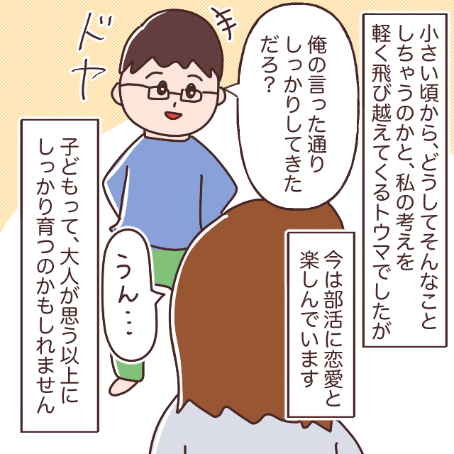 小さい頃から、どうしてそんなことしちゃうのかと、私の考えを軽く飛び越えてくるトウマでしたが今は部活に恋愛と楽しんでいます。そんなトウマを見て夫は「俺の言った通りしっかりしてきただろ?」とドヤ顔。子供って大人が思う以上にしっかり育つのかもしれません。
