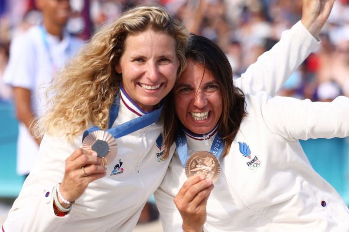それぞれ子どもを持つ母親であることから、「ママ・チーム」のニックネームで知られるセーリング(スキフ)のフランス代表、シャルリーヌ・ピコン選手(写真左)とサラ・ステヤール選手(写真右)。2人はマルセイユの会場で競技を終え、ビーチに戻ったところでそれぞれのパートナーからプロポーズされた。