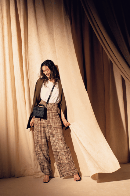 軽やかな素材で下半身が重く見えないので、スタイルよく着られる。ゆるっとした肩掛けや細いストラップサンダルで、女っぽさをプラス。パンツ¥75,000(エリカ カバリーニ/ロンハーマン)ジャケット¥28,000(エイチ ビューティ&ユース)Tシャツ¥11,000(エイトン/エイトン青山)バッグ¥44,000(ウィッカー ウィングス/ジャーナル スタンダード 表参道)サンダル¥28,000(ジャガー/エーピー ストゥディオ グランフロント オオサカ)