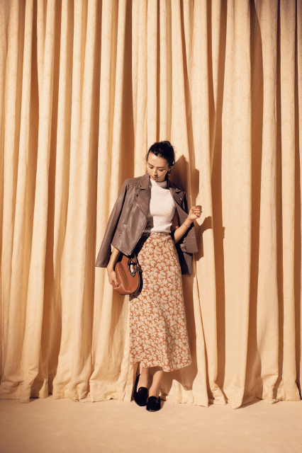 大人な花柄でリズムをつけて。スカート¥11,000(SNIDEL/SNIDELルミネ新宿2店)ライダースジャケット¥59,000(PINKY&DIANNE)カットソー¥6,400(FRAY I.D/FRAY I.D ルミネ新宿2店)バッグ¥44,000〈ペリーコ〉シューズ¥69,000〈ESTNATION×PELLICO〉(ともにアマン)ピアス¥21,000(シンパシー オブ ソウル スタイル/フラッパーズ)バングル¥10,000(フィリップ オーディベール/ジャーナル スタンダード 表参道)