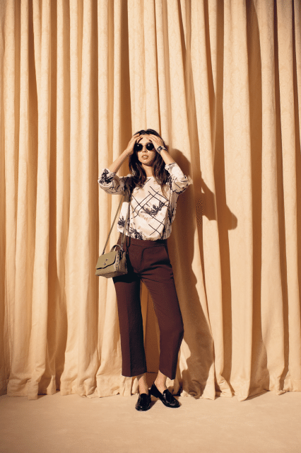 水彩フラワーの色を拾って、パンツも茶系でリンク。足元は黒のローファーでマニッシュに仕上げたい。ブラウス¥34,000(エキップモン/サザビーリーグ)パンツ¥20,000(ウィム ガゼット/ウィム ガゼット ルミネ新宿店)バッグ¥68,000(ザネラート/アマン)シューズ¥16,500(アルテサノス/ジャーナル スタンダード 表参道)サングラス¥35,000(モスコット/モスコット トウキョウ)バングル¥29,000(ノース ワークス/UTS PR)