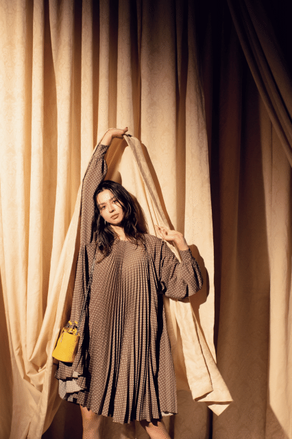 茶系にするとより一層レトロムードが増すドット柄。柄の存在感はもちろん、たっぷり贅沢に施したプリーツのおかげでワンピース一枚なのに目に留まる華やかさ! ミニバッグをワンポイントに、パリジェンヌのような可愛げのある着こなしに。ワンピース¥48,000(エリカ カヴァリーニ/ジャーナル スタンダード表参道)バッグ¥139,000(ロジェ ヴィヴィエ/ロジェ・ヴィヴィエ・ジャパン)ピアス¥180,000(プラウ/フラッパーズ)