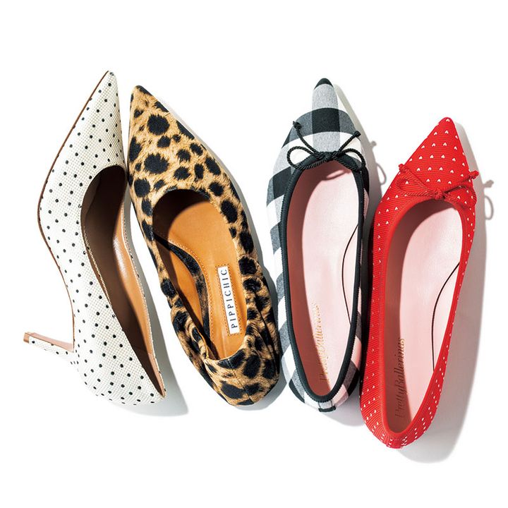 右から【赤】赤の小ドット柄はパリジェンヌ気分で。〈H1〉¥28,600(プリティ・バレリーナ/F.E.N.)【チェック】デニムやふんわりスカートにギンガムチェックらしい可憐な雰囲気を。〈H1〉¥28,600(プリティ・バレリーナ/F.E.N.)【レオパード】アニマル柄は、今っぽい深めのフォルムがキー。かかとゴムなので、一日歩き回る日に。〈H1〉¥35,200(ピッピシック/ベイジュ)【白】クラシックなモノトーンのドット柄は、コンサバ派におすすめ。〈H7〉¥52,800(ペリーコ/アマン)