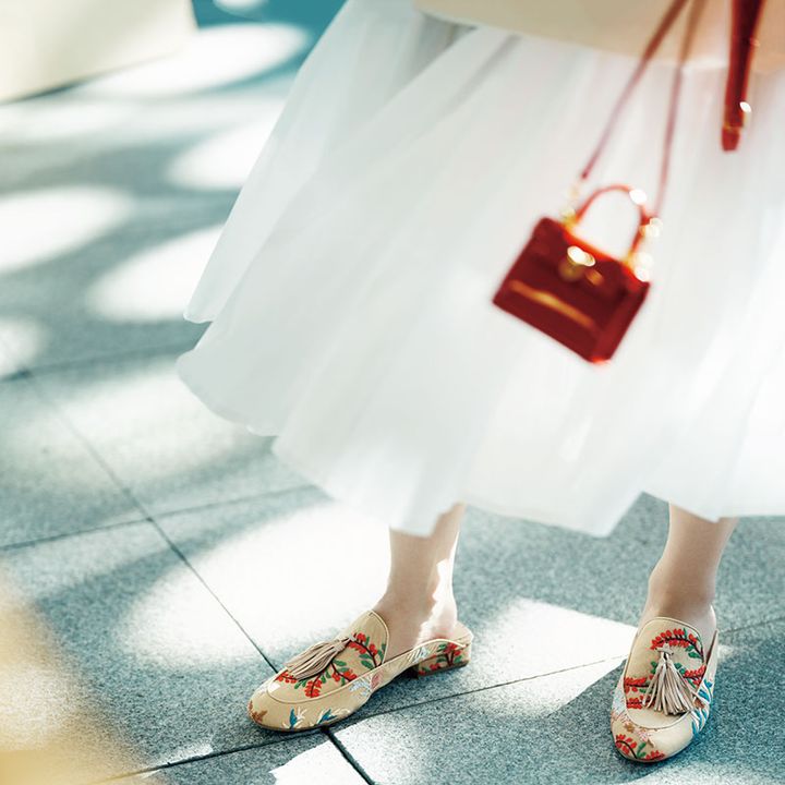 メンズライクなスリッポンにエキゾチックな花柄を刺繍した唯一無二な靴は、目に入るたびモードな感性を高めてくれる逸品。一見難しそうな柄物は、小物で統一感を。同トーンの赤のミニポシェットを重ねれば、オシャレにこだわりを持った大人のスタイリングに!シューズ〈H1〉¥27,500(ツル バイ マリコ オイカワ)ワンピース¥39,600(ビリティス・ディセッタン/ビリティス)バッグ¥198,000(ロウナー ロンドン/エイチ アイ ティー)