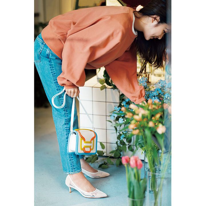 巷で話題のフラワーショップには、カジュアルなスウェットやデニムはキープしつつ、靴で特別感を叶えるのがちょうどいい。優しく透ける白のメッシュ素材で、春気分を満喫。シューズ〈H5.5〉¥25,300(ツル バイ マリコ オイカワ)スウェット¥16,500(プロタゴニスタ/アマン)Tシャツ¥9,680(スローン)パンツ¥20,900(ザ シンゾーン/シンゾーン ルミネ有楽町店)バッグ¥111,100(ピエール アルディ/ピエール アルディ 東京)
