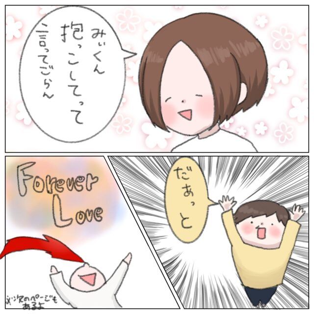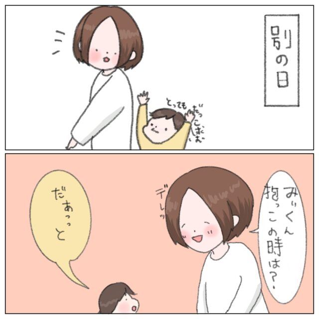 2歳の男の子みぃくんのお母ちゃんであるねむりひつじさんから、「抱っこ」という言葉を覚えたみぃくんのお話です。