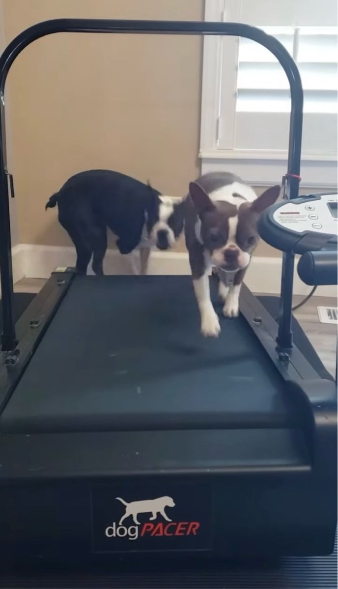 ルームランナーを楽しむボストンテリアたち。 2匹は肩を並べて走り始めました。