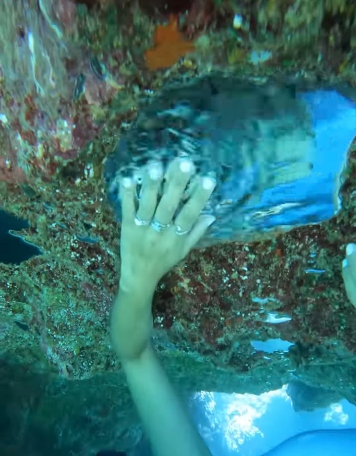 ダイバーさんが手を入れると、表面の膜がゆらゆらと揺れます。 まるで水たまりに触れているかのようですが、これがあるのは海中なのです!