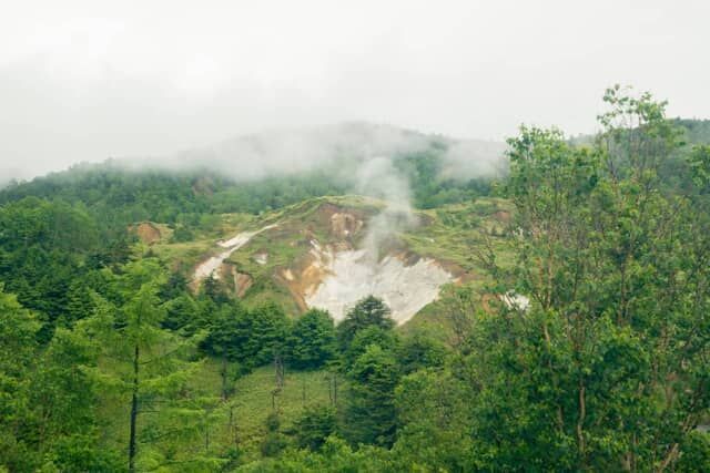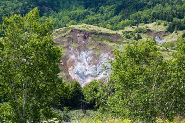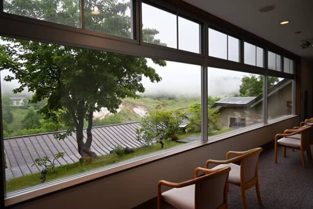 露天風呂や一部の客室から見える “空吹(からぶき)” は古い噴火口の跡で、地下水や雨水が水蒸気となって噴き出ています。有毒な火山性ガスのため、植物が生えず、立ち入り禁止になっています。
