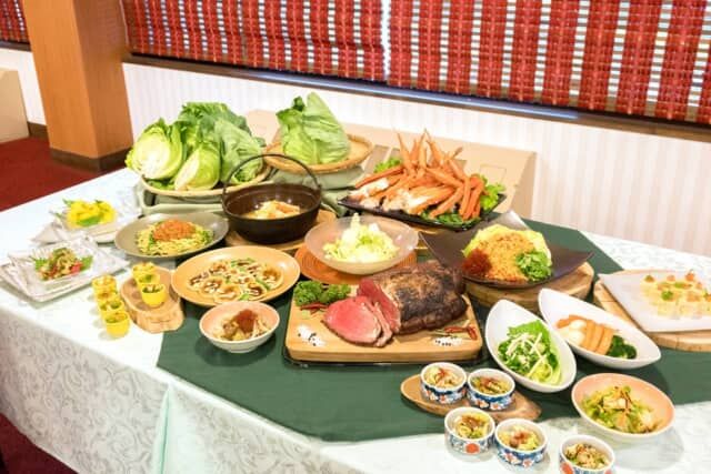 秋のブッフェメニューは、万座プリンスホテルのシグネチャーメニュー蟹とローストビーフが食べ放題。嬬恋キャベツの「419」を使ったメニューも並びます。