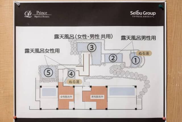 1番と2番は男性専用露天風呂、3番は混浴で利用。4番5番が女性専用です。この他、大きな湯船で屋根つきの女性専用露天風呂「しゃくなげの湯」もあります。