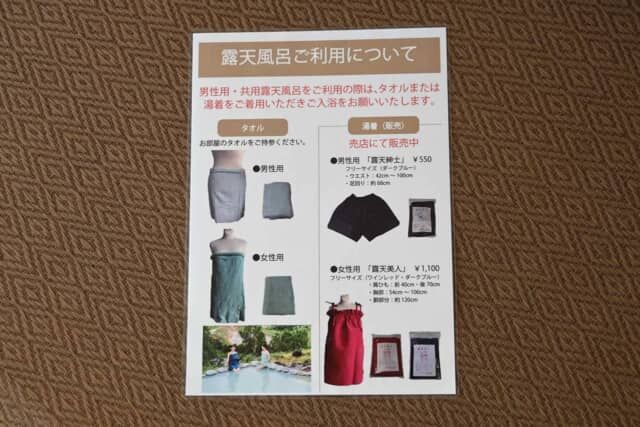男女それぞれ温泉で使用できるタオルは客室に用意されるほか、楽に着用できる湯あみ着も売店で販売しています。これなら視線を気にすることなく、夫婦やカップルで混浴を楽しめます。