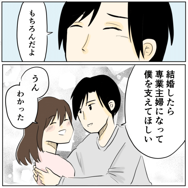 すると「もちろんだよ」タクマさんはそう言った後で「結婚したら、専業主婦になって僕を支えてほしい」とカナコさんにプロポーズ、それを聞いたカナコさんはタクマさんの申し出を喜んで受け入れました。