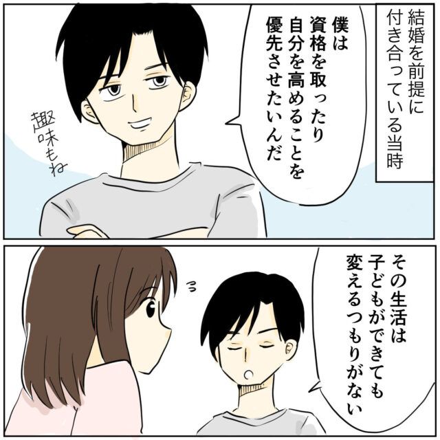 これは、カナコさんとタクマさんが結婚を前提に付き合っている当時のこと、「僕は資格を取ったり自分を高めることを優先させたいんだ。もちろん趣味もね。そして・・その生活は、子どもができても変えるつもりがない」タクマさんに突然そう言われたカナコさんは驚きました。