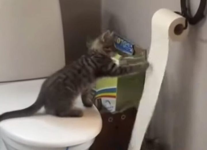 この遊び、止まらないんだよねー! トイレットペーパーを回す子猫