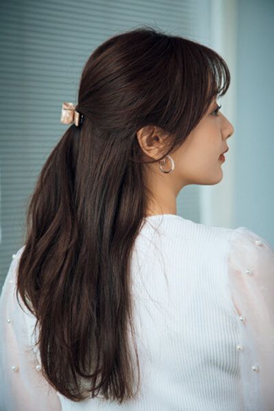 ブラウンリップを若々しく見せてくれるのは、清楚なハーフアップ。ツヤが出るよう表面をキレイに整えてハーフアップに結んで、ゴムを隠すようにバレッタをオンして。