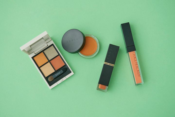 左から・シンクロマティック アイシャドウパレット EX-08 ¥6,380(数量限定)/RMK グラムトーンカラーカスタード 03 ¥3,300/スリー コンフォート リップ フルイド フォグ 112 ¥5,500(数量限定)/スック リップ セラム ティント 005 ¥3,520/アディクション