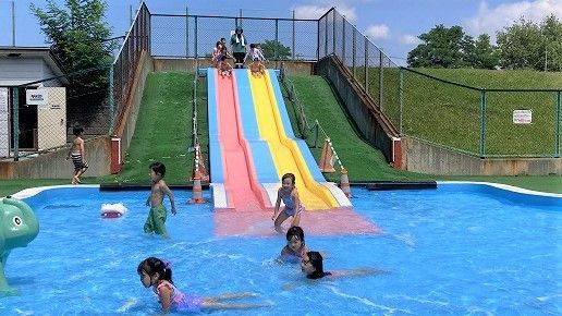 プールの奥にはカラフルで大きな遊具も!プールで遊び終わった後まで楽しめますね。