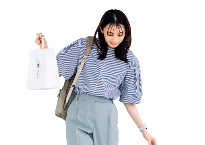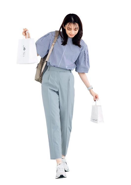 ジレ×パンツSET(パンツ)¥12,000/PLST ストライプブラウス¥10,450/ミラ オーウェン ルミネ新宿2店 リュックサック¥15,950/ペルケ(アンビリオン) ベージュスニーカー¥13,530/ナイキ スポーツウェア(NIKE) スマートウォッチ¥8,980/シャオミ・ジャパン