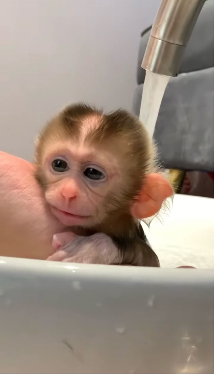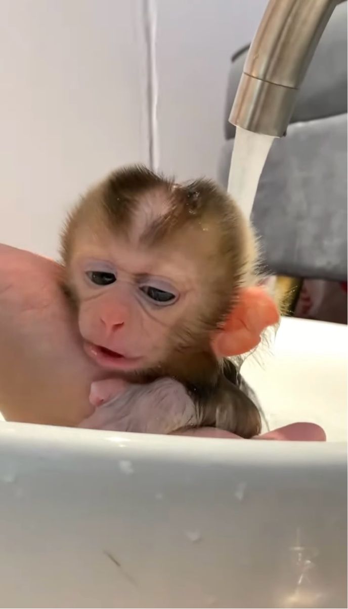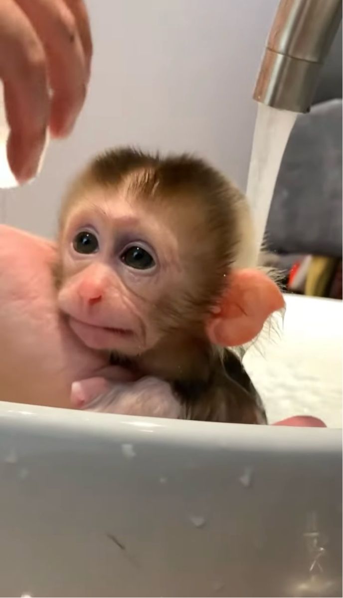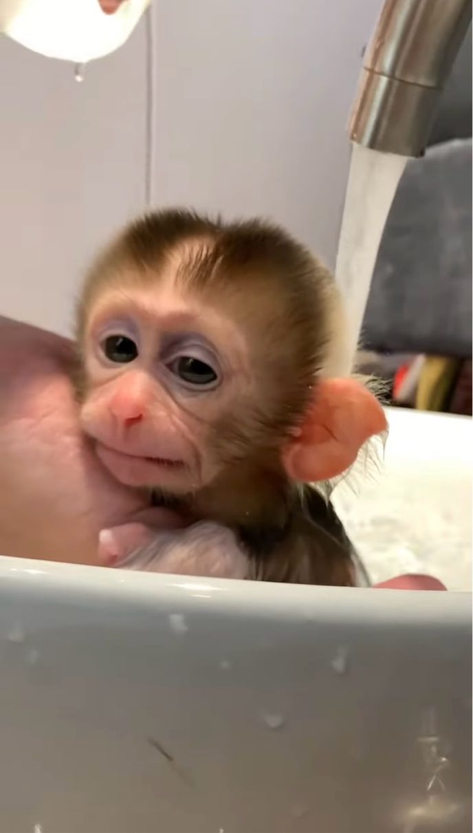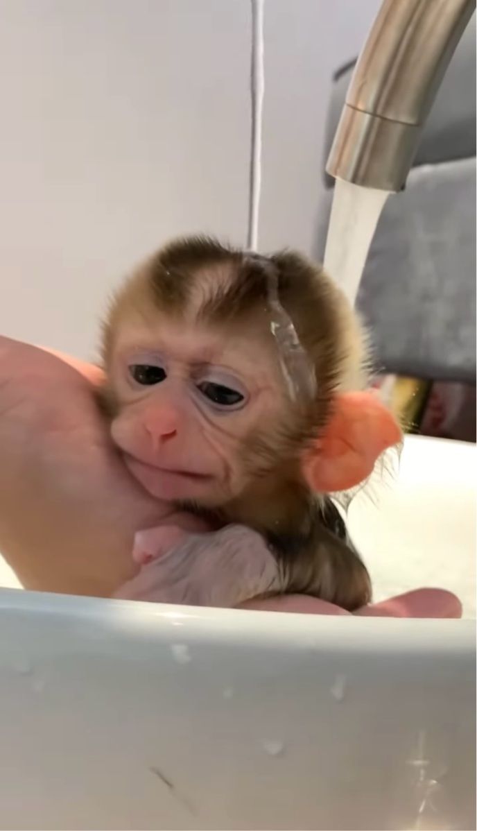 飼い主さんに体を流してもらうサルの赤ちゃん。 バスタイムを気に入ってくれるかな?