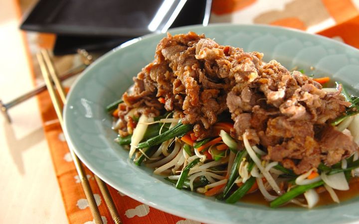 リンゴやハチミツ入りの絶品甘辛ダレがおいしさの秘訣。漬け込んだラム肉を野菜と一緒にサッと炒めるだけで、ジンギスカン風の一皿に。ピリッと辛味も効いていて、ご飯もビールも進みそうです。