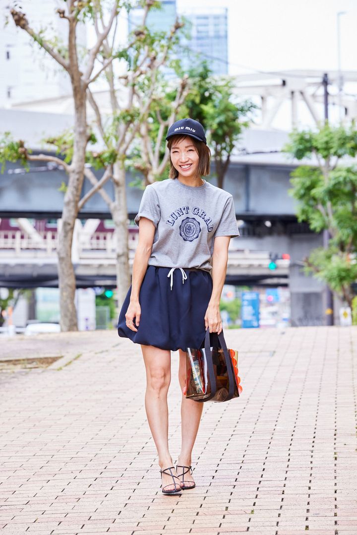 「ラドローのカゴバッグは、ほかにはないデザインが魅力的。大人っぽい可愛らしさがあって、シンプルになりがちな水際コーデをおしゃれに見せてくれるので助かります。これを持つ日はジュエリーも少なめ、小物もシンプルにまとめてバッグが主役のコーデを楽しんでいます」中山 希さん・156cm(医師/2歳の男の子ママ)