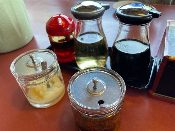 醤油、酢、ラー油、にんにく、ラー油の辛子、こしょうです。