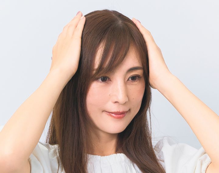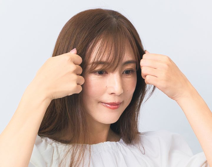 ヘアオイルをなじませます。加齢により広がりやすいアゴ下の髪や、自分のクセが出やすい部分によく揉み込んで。
