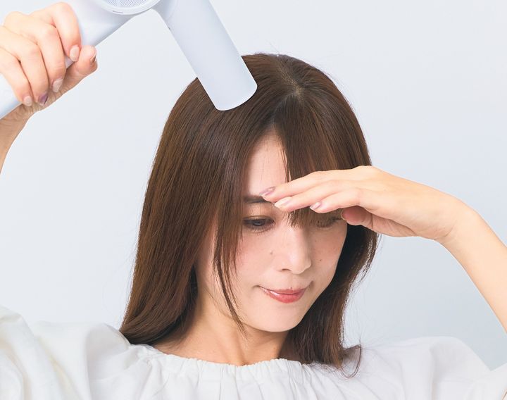 頭頂部に風を当てて、全体を乾かします。髪を前に引き出すように手グシを通し、根元を潰して全体の膨らみを抑えます。